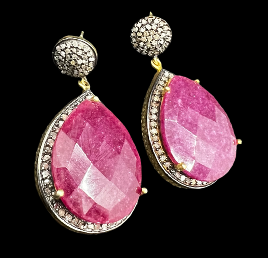 Genuine Pave’ Diamond Earrings with teardrop ruby color agate gemstone